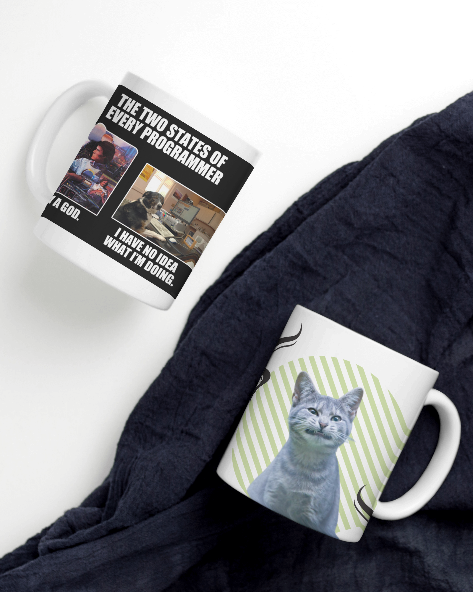White Printed Mug – I Am God Coder Meme With Funny Cat